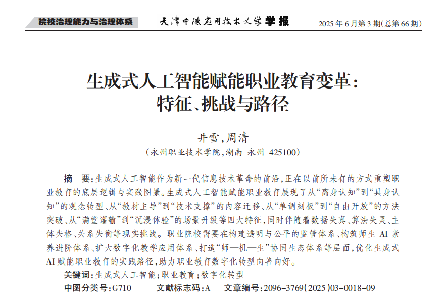 参考文献引用格式:生成式人工智能赋能职业教育变革:特征、挑战与路径[J].天津中德应用技术大学学报,2025(03):18-26.
